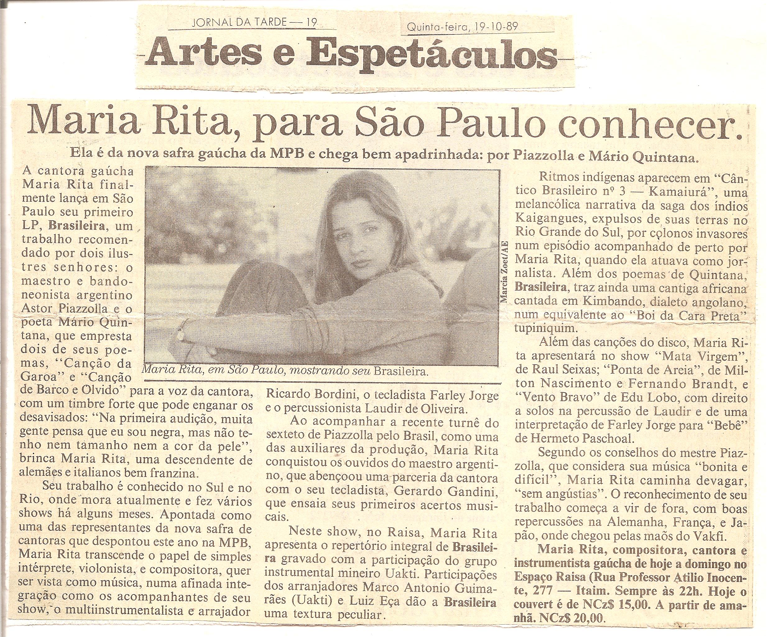 October/1989 - Jornal da Tarde SP Coluna - Artes e Espetáculos